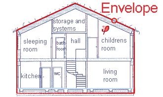 In the case of heating or cooling, the area of interest is the “heated or cooled space” or more precisely: it includes all areas in a building in which comfortable thermal conditions should prevail. It is usually convenient to include all “passively heated” areas in the balance, if the balance envelope is simplified in this way. Generally, the choice of the balance envelope is seen primarily in pragmatic terms: for a building it is particularly convenient to opt for the balance limit on the outside of the thermally insulated external building components. (Fig. 1)