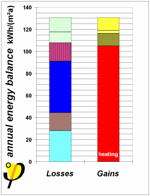 As the heat losses can be easily and relatively acurately calculated (they depend to a considerable extent on the insulation), and the internal heat sources as well as the passively utilised solar energy can be estimated well enough, it is possible to calculate the remaining heat supply required (the heating demand) using the energy balance.