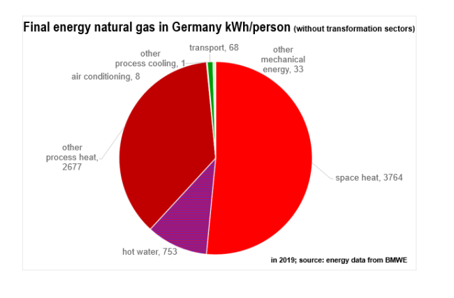 Allocation of final energy for gas consumption to application areas for the year 2019 in Germany (based on [BMWK 2021]):