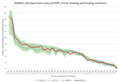 The Passive House Planning Package (PHPP) version 9.6 was evaluated in accordance with ANSI/ASHRAE Standard 140, a comparative testing method for building energy programs. The validation tests consist of a series of carefully described sample case building plans. Results from modelling different test cases with the software being tested are compared to those of reference software results. The class II test cases, geared towards annual building energy use, comprise a total of 38 test cases, 21 for heating and 17 for cooling.