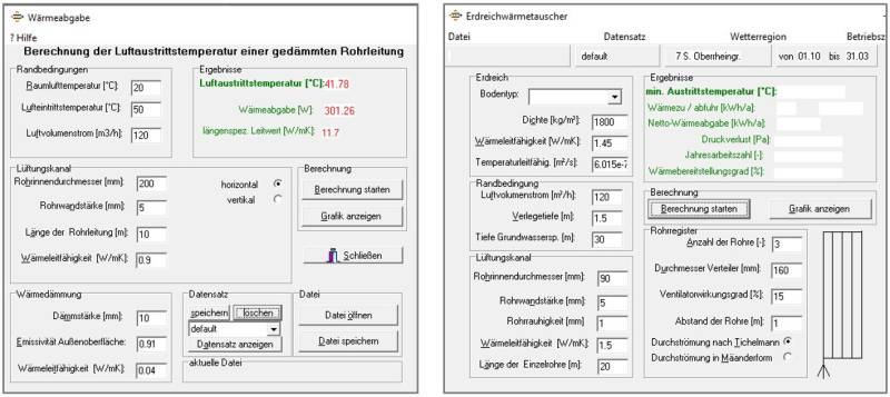 With the main menu item Earth duct, you reach the part for the calculation of earth heat exchangers. This allows you to calculate the heat output of earth heat exchangers in through-flow according to Tichelmann or in meander form. For input into the Passive House Project Planning Package (PHPP), you need the annual average heat supply rate, which is also output with this Tool. In addition to calculating the results, you can also output the temperature curves graphically.