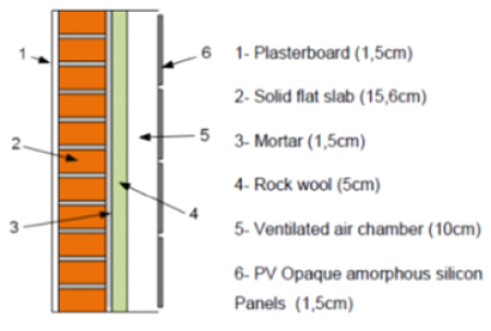 Two façade systems were compared under Madrid (Spain) climate condition: a base wall BW (plaster + concrete blocks + cement mortar) and a photovoltaic ventilated facade PVF (base wall + thermal insulation+ air chamber+ opaque a-Si photovoltaic glass).