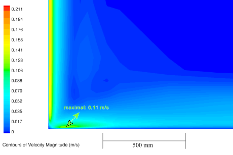 • Air speeds in the room (apart from leaks – which do not occur in the airtight Passive House anyway) are due to uplift at surfaces which have differing temperatures. Because of the small temperature differences the lifting forces are very small. As a result, air speeds also remain very small. Fig.1 shows a CFD (Computational Fluid Dynamic) simulation: even though there is a heater under the window, no draughts occur in the living area.